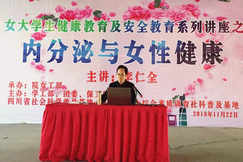 根据“奋进新时代 中华传统美德天府职教行”川职院活动周的活动安排,11月22日下午,由学工部、团委、保卫处和高职学生综合素质训育社科普及基地主办,院学生会女工部承办的“女大学生安全教育及健康教育系列讲座之女大学生安全和内分泌与女性健康”专题讲座在大学生活动中心(二食堂三楼)举行。