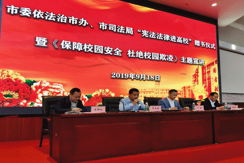 为预防校园霸凌,建立平安校园环境,确保我院大学生的身心健康成长,9月18日上午,由市委依法治市办、市司法局、市教育和体育局与我院联合开展的 “保障校园安全,杜绝校园欺凌”主题宣讲活动在我院学术报告厅举行。学院党委委员、副院长胥长寿、遂宁市司法局党委书记徐南平、遂宁市教育和体育局副局长邓磊等参加了活动,学院相关职能部门负责人及200余名女大学生代表到场聆听。