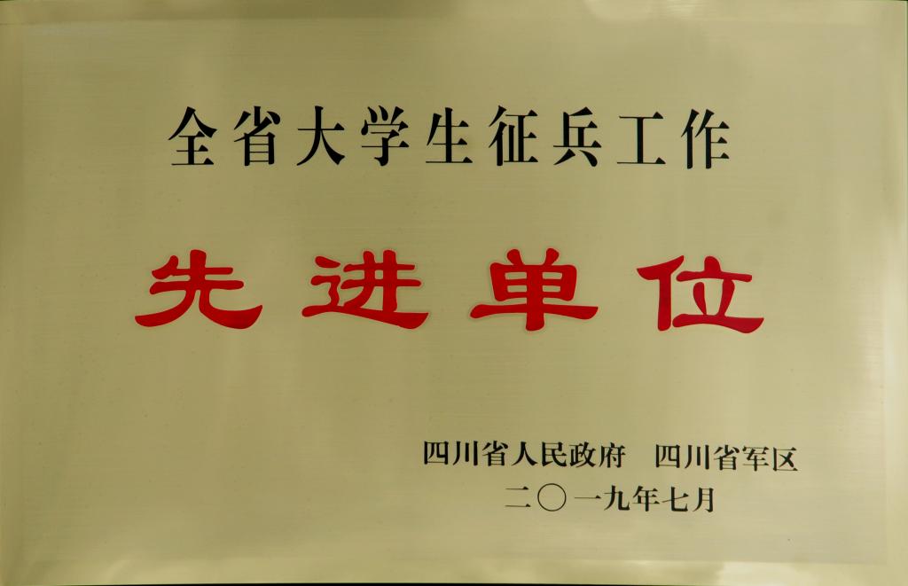 2018年,学院征兵工作始终坚持以习近平新时代中国特色社会主义思想为指导,深入学习贯彻党的十九大精神和习近平强军思想,认真落实党中央、国务院、中央军委各项决策和省委、省政府、省军区安排部署,坚持以兵员质量为核心,狠抓各项工作落实。在学院党委的正确领导下,通过武装部全体老师共同努力,在各系的密切配合下,全院师生齐心协力,圆满完成新兵征集任务,并取得优异成绩,继2016年后,我院2018年征兵工作再次被四川省人民政府,四川省军区授予“全省大学生征兵工作先进单位”荣誉称号。