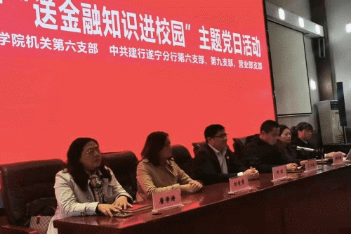 为全面深入宣传普及金融知识,进一步履行社会责任,积极教育引导在校大学生群体权益保护意识和提升自我保护能力,机关六支部结合支部工作特点与建行遂宁分行营业部支部于3月26日15:00,在学院学术报告厅联合开展了机关六支部党日活动暨“金融知识进校园”宣讲活动。