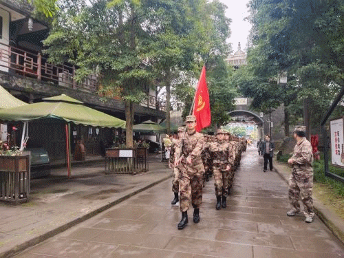 在短暂的热身活动后,在教官的带领下,同学们进行了基础的列队基础动作训练。训练时,队员们个个精神抖擞、斗志昂扬,队列紧凑,步伐整齐,口号洪亮,队形变换迅速有序,动作有力、整齐化一,充分展示了平时刻苦训练的结果以及积极向上的精神面貌,赢得了在场老师和教官们的一致赞扬。紧接着是拉练活动,同学们完成了从基地到龙凤古镇的拉练活动,整齐一致的步伐引得路上行人为之赞叹。接着,同学们陆续进行了“桃花朵朵开”“同心鼓”“动力圈”以及“传递乒乓球”等拓展项目。其中,“同心鼓”项目需要团队成员手拿着系鼓的绳子一起用力,用鼓面击球,对每个人动作的力度、角度等要求较高,队员们互相鼓励,协调一致,全身心投入,顺利完成了该项目;“传递乒乓球”项目则需要所有队友互相信任,在最短时间内下有序地传递乒乓球。在这些充满挑战、智慧和趣味的项目中,同学们互相支持、团结合作、克服困难,一次又一次地战胜了自我,实现了目标,也充分展示了“川职星火”预备队的积极、健康、向上的精神面貌。