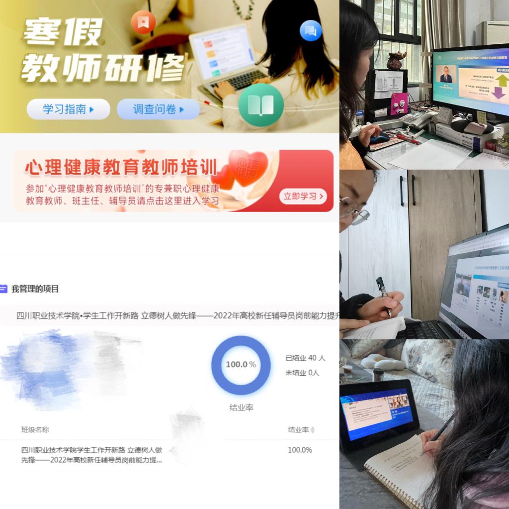 寒假期间,学生工作部依托国家教育学习平台组织我校学工系统教师开展能力提升专题培训,圆满完成新任专兼职辅导员能力提升及学工队伍心理健康教育两项培训任务,为新学期充电赋能。