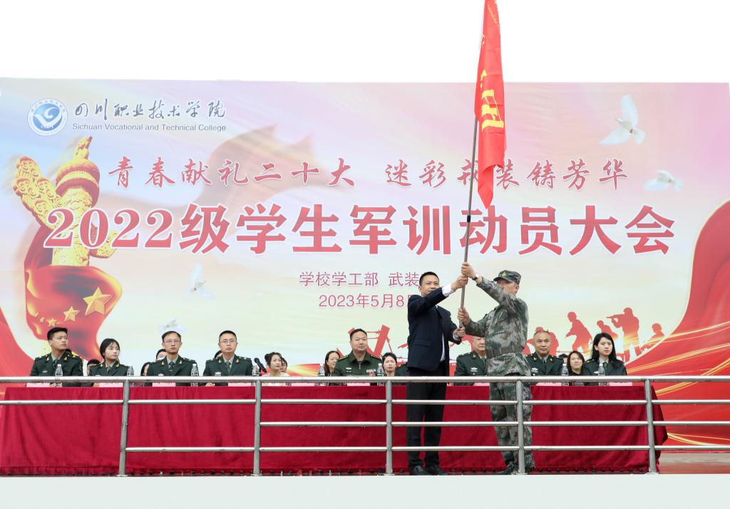 动员大会在奏中国人民解放军军歌中开起。学校党委副书记、军训总指挥胥长寿为2022级学生军训团授旗,并发表讲话,他首先代表学校党委、行政向参训同学致以亲切的问候!向前来我校承担新生军训工作的船山区武装部的各位领导、教官们表示衷心的感谢和崇高的敬意!他指出,作为新时代青年,要谨遵习近平总书记“强国必须强军,军强才能国安”的教导,时刻将祖国命运与自我相联系,顽强拼搏、奋勇担当,不负青春韶华,不负时代使命。加强学生军训不仅是我校推动大学生履行兵役义务、接受国防教育、厚植爱国情怀的重要方式。为做好2022级学生军训工作,他向同学们还提出三点希望和要求:一要提高认识,勇于担当。青年学生应承担起历史所赋予的时代使命,为国家与民族的发展奉献自己的青春与热血;二要磨练意志,严于律己。要传承人民军队红色基因,弘扬人民军队优良传统,增强服从命令的自觉性,展示新一代川职学子奋发向上的精神风貌;三要团结协作,协同配合。学校各部门要加强协同、加强合作,科学组训、安全施训,以科学严谨的态度,扎实做好军训安全工作,坚决把学生的安全健康放在首位,全力以赴完成好此次军训任务。