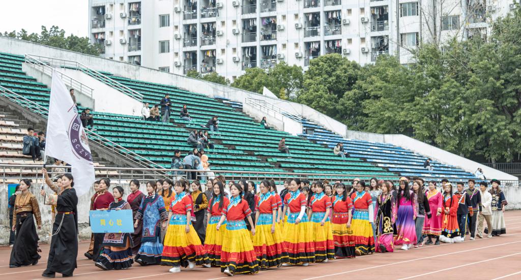 开幕式上,由藏族、彝族等各少数民族学生组成的民族学生代表方队和同心社、星火预备队等社团代表组成的代表方队在主席台前依次亮相。特色鲜明的各个方队迈着整齐划一的步伐,昂首阔步在红色跑道上。现场气氛热烈,引来阵阵掌声,展现了我校各族学子跨步踏征程的青春风采。