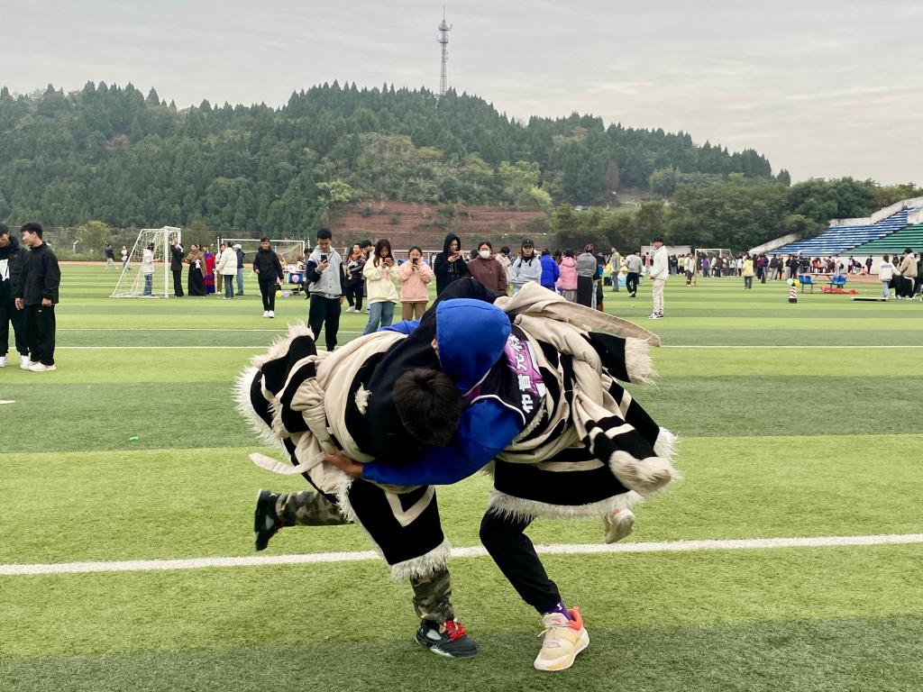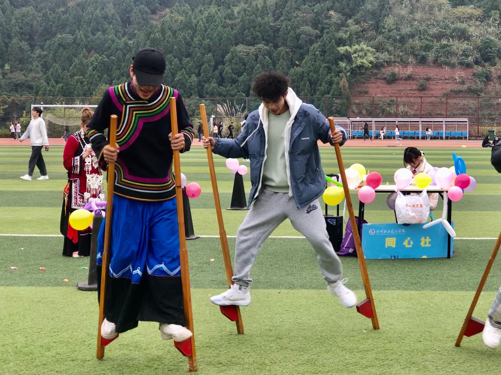 运动会开展了穿藏装、抢新娘、踩高跷、摔跤、投壶、滚铁环等特色趣味运动项目。各个项目将民族特色融入体育运动,将竞技与娱乐结合、教育与文化相融,以运动方式加强民族文化交流、展现我校各族学生朝气蓬勃的精神面貌和民族团结一家亲的友谊之情。