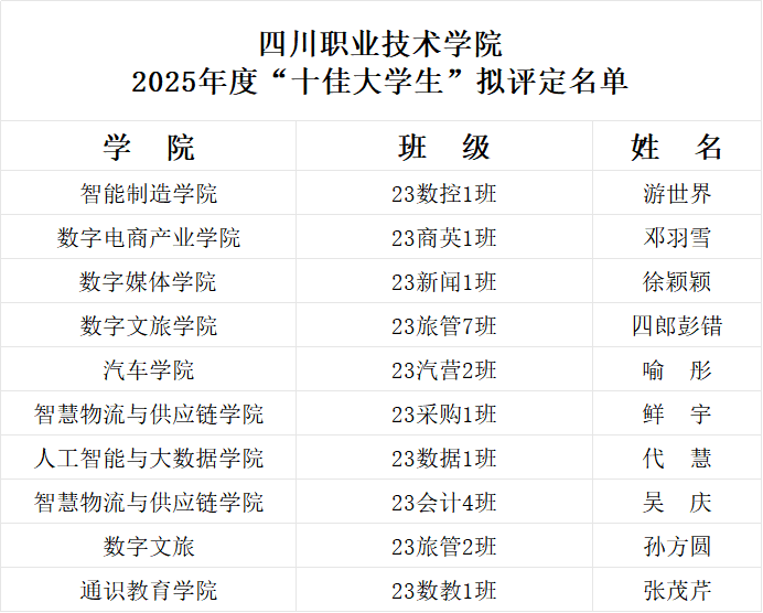 下一步,学生工作部将深入挖掘并广泛宣传2025年度“十佳大学生”的先进事迹,充分发挥其示范引领与价值导向作用、强化榜样育人实效,激励广大川职学子坚定理想信念,挺膺时代担当。