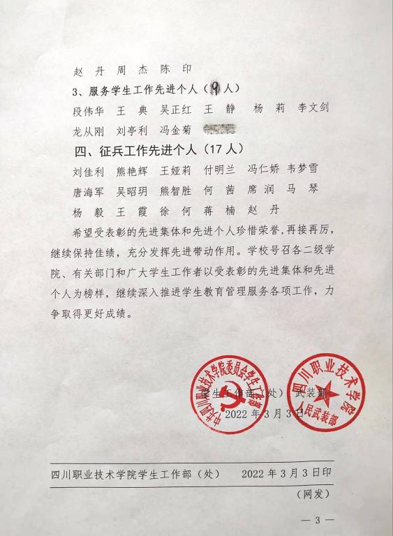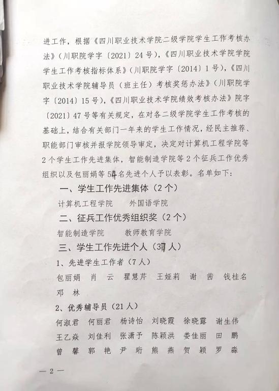 2021年,我校学生教育管理工作以习近平新时代中国特色社会主义思想为指导,坚持立德树人,贯彻落实党的十九大、十九届历次全会精神,紧紧围绕学院“双高”建设核心目标,服务学院发展大局,以生为本,以学生思想政治建设为纲领,学生意识形态教育和日常管理工作层润化,特色校园活动规范化,师生团队建设职业科学化,在全面完成疫情防控要求的前提下,完成了各项工作并取得了可喜成绩,涌现出一批先进集体和先进个人。为了充分肯定成绩,有效促进工作,根据《四川职业技术学院二级学院学生工作考核办法》(川职院学字〔2021〕24号),《四川职业技术学院学院学生工作考核指标体系》(川职院学字〔2014〕1号),《四川职业技术学院辅导员(班主任)考核奖惩办法》(川职院学字〔2014〕15号),《四川职业技术学院绩效考核办法》院字〔2021〕47号等有关规定,在对各二级学院学生工作考核的基础上,结合有关部门一年来的学生工作情况,经民主推荐、职能部门审核并报学院领导审定,决定对计算机工程学院等2个学生工作先进集体,智能制造学院等2个征兵工作优秀组织以及包丽娟等54名先进个人予以表彰。名单如下: